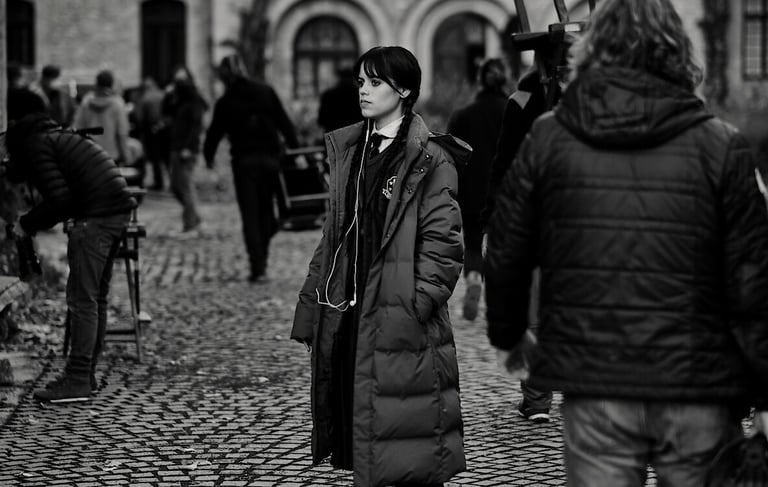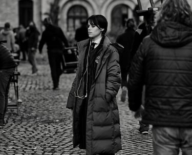 Wednesday was filmed between September 2021 and March 2022 in Romania, primarily in and around the city of Bușteni, nestled in the Southern Carpathian Mountains. The country's dramatic landscapes and historic architecture provided the perfect gothic backdrop for the eerie world of Nevermore Academy and its surrounding town, Jericho.